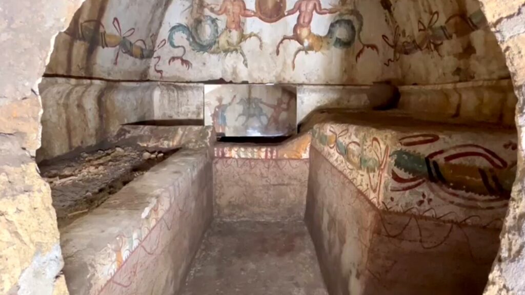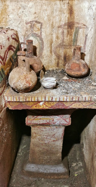 Intatto è stato ritrovato anche il corredo funerario, tra cui un altare con i vasi per le libagioni; su tre kline dipinti, ossia i lettini funerari greco-romani, sono stati rinvenuti i corpi inumati.