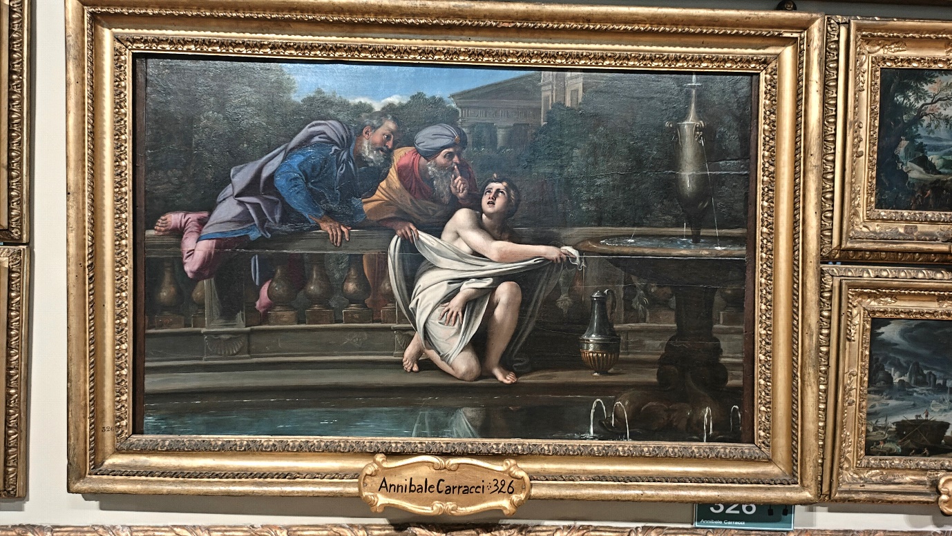 La scena è tratta da un antico episodio biblico. Susanna è una giovane donna ebrea, vestita con una tunica candida come la sua pelle e sta per lavarsi, d’estate, nello splendido giardino della propria casa. Su di lei, in atto di spiarla, si avventano, tirandole la veste e intimandole il silenzio, due intrusi anziani (i vecchioni) che minacciano di denunciarla al marito per un tradimento inesistente a meno che non si concedesse a loro. Sdegnata, Susanna si rifiuta e i vecchioni la denunciano. Sta per essere condannata da una giuria popolare quando a sua difesa interviene il profeta Daniele con le sembianze di un ragazzo che ammonisce la giuria prima di condannare una donna innocente. Rivolge così delle argute domande ai suoi accusatori smascherando la loro falsa testimonianza, scagionandola e facendo condannare i vecchioni. L’episodio biblico ha ispirato tanti artisti, sia prima che dopo il dipinto del Carracci, ma quest’opera sia dal punto di vista cromatico sia dal punto di vista del significato morale, si basa sulla dicotomia tra bene e male, tra chiaro e scuro: i vecchioni sono figure negative, contraltare della virtuosa Susanna. Tanto lei è pura e desiderosa di libertà, coraggiosa perché si oppone ai suoi aguzzini e li denuncia, tanto i vecchioni sono impuri, lussuriosi coi loro sguardi carichi di libidine.