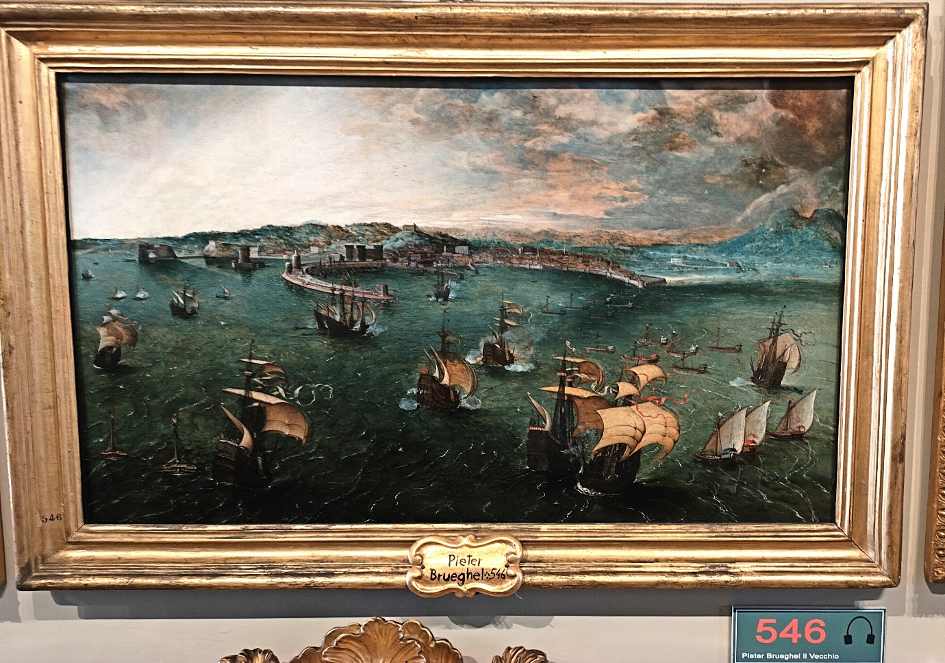 In primo piano s’intravede forse una battaglia navale, che coinvolge diverse imbarcazioni tra cui galee, velieri e altri più piccole. Sullo sfondo su vede la città ed il Vesuvio, raffigurati con un orizzonte rialzato, oltre la metà del dipinto, tipico degli artisti fiamminghi, che permette di dare un respiro più ampio alla veduta.